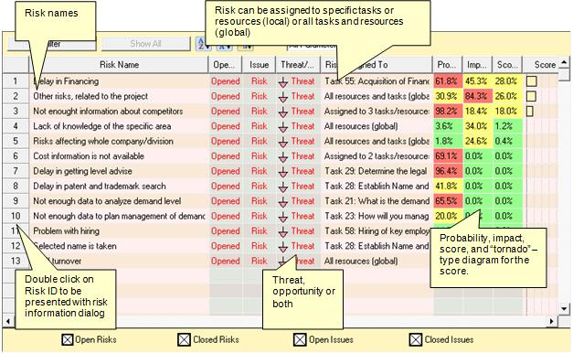 be opened and closed, risks or issues, assigned to different tasks
